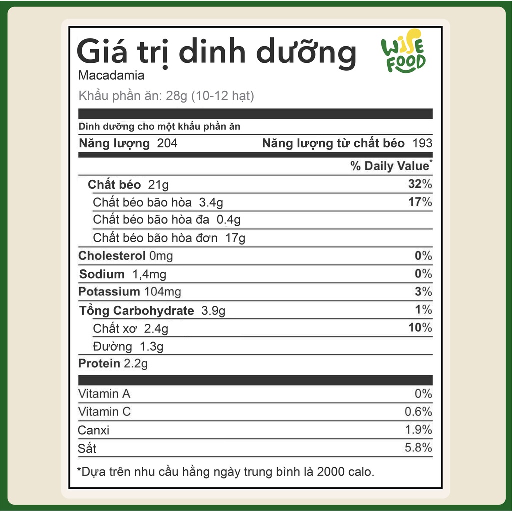 Tại sao bạn lựa chọn hạt dinh dưỡng Wise Food? Nguyên liệu 100% Macca Việt Nam Hạt luôn được đóng gói trong hộp pet có nắp giật tiện lợi, bảo quản hạt ở điều kiện tốt nhất, giữ cho hạt thơm ngon Sản phẩm cung cấp đầy đủ dinh dưỡng có lợi cho sức khỏe, mọi đối tượng đều có thể sử dụng. Đặc biệt là người ăn kiêng, ăn thô, mẹ bầu, gymer. 💥 Sản phẩm Hạt Macca sấy nứt vỏ Wise Food - 100% từ thiên nhiên, không sử dụng chất bảo quản, gia vị. - Macca đã sấy mộc, có thể ăn trực tiếp - Hạn sử dụng: 6 tháng kể từ ngày sản xuất - Hỗ trợ đổi trả hàng trong vòng 7 ngày nếu có lỗi từ nhà sản xuất 🌸 Đối tượng sử dụng - Mọi người, mọi lứa tuổi và mọi chế độ ăn 🌱Cách dùng - Dùng trực tiếp - Chế biến các món ăn, ăn cùng sữa chua hoa quả, làm bánh, - Làm sữa hạt 💥 Công dụng hạt Macca - Bảo vệ tim mạch, giảm cholesterol xấu - Bổ não, tăng cường trí nhớ - Giảm béo - Đẹp da và tóc - Cũng cấp chất xơ 🍍 Chịu trách nhiệm: Công ty TNHH Wise Food, địa chỉ khu đô thị Geleximco, Dương Nội, Hà Đông, Hà Nội. 📞 0325861088 Website: wisefood.vn 💚 Wise Food luôn hướng đến sức khỏe của người dùng, mong muốn đưa cuộc sống cân bằng và lành mạnh đến với mọi lứa tuổi. 💚